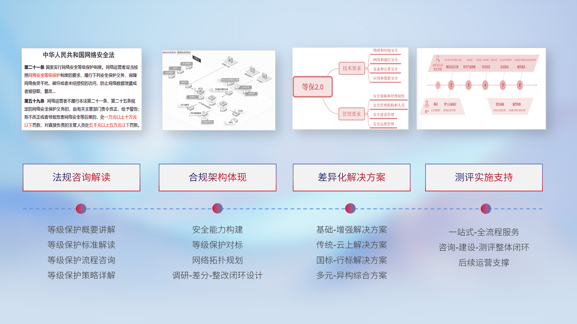 通过专业的法律咨询解读、、、合规架构体现、、、差异化解决方案、、测试实施支持等服务,,为客户量身打造等保合规体系。。
